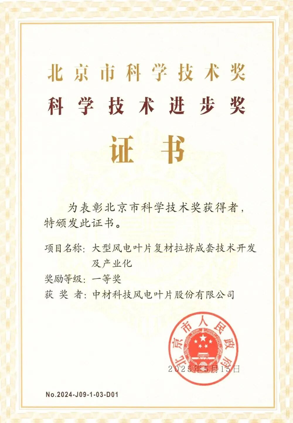 近期,2024年度北京市科学技术奖励大会在京召开,由中材科技股份有限公司所属中材科技风电叶片股份有限公司(简称“中材叶片”)牵头,联合北京玻钢院复合材料有限公司、泰山玻璃纤维有限公司等多家单位共同完成的大型风电叶片复材拉挤成套技术开发及产业化项目,荣获2024年度北京市科学技术奖科技进步奖一等奖。