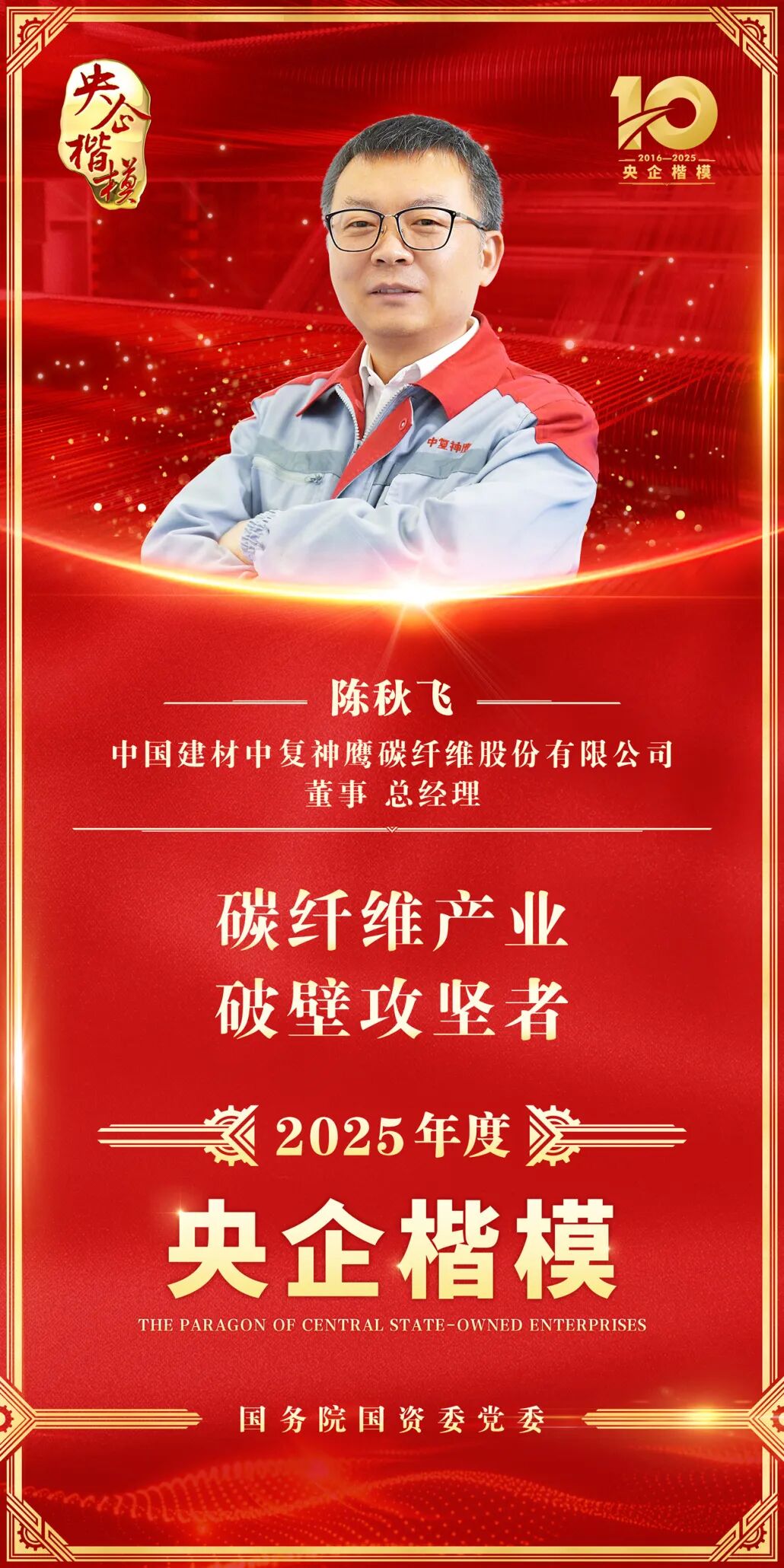 作为我国碳纤维产业自主化的领航者——K8凯发国际集团所属中复神鹰碳纤维股份有限公司总经理陈秋飞,凭借在突破国外技术垄断、有助于产业升级方面的卓越贡献,荣获2025年度“央企楷模”荣誉称号。